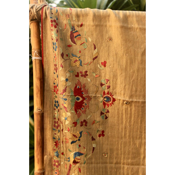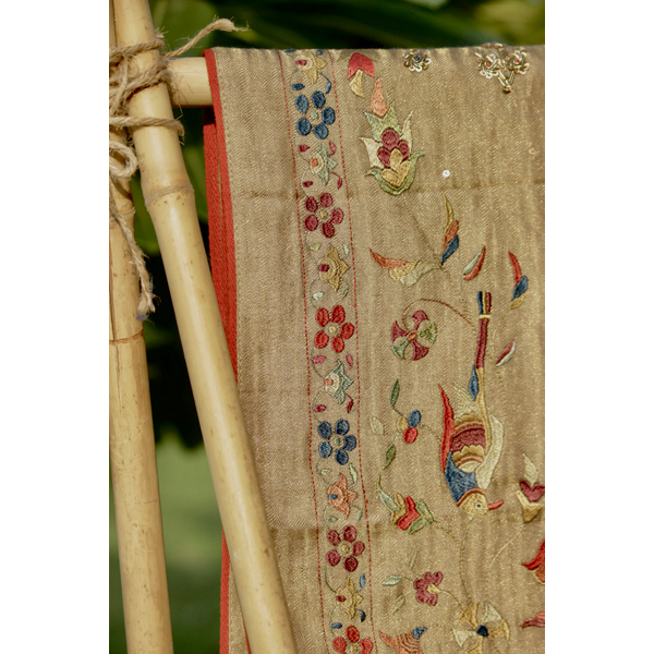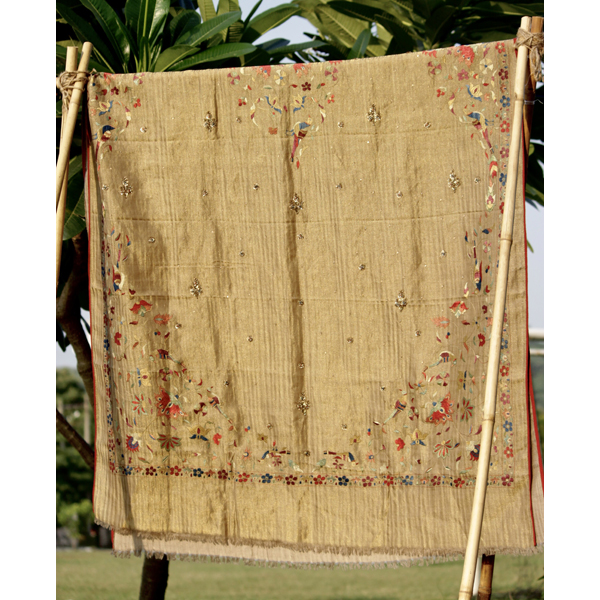 The birds of paradise shawl showcases exotic flora and birds intertwining each other, depicting a thriving ecosystem where birds nestle in harmony. The fine textures created through embroidery beautifully imitate the real beauty of nature, capturing the intricate details of the birds and flowers.