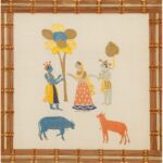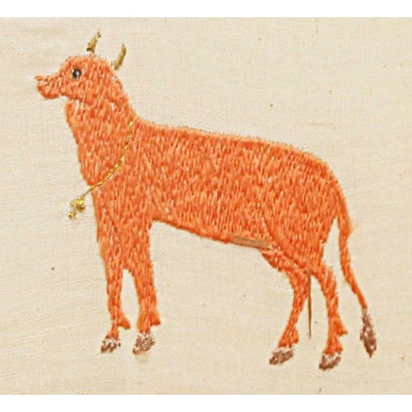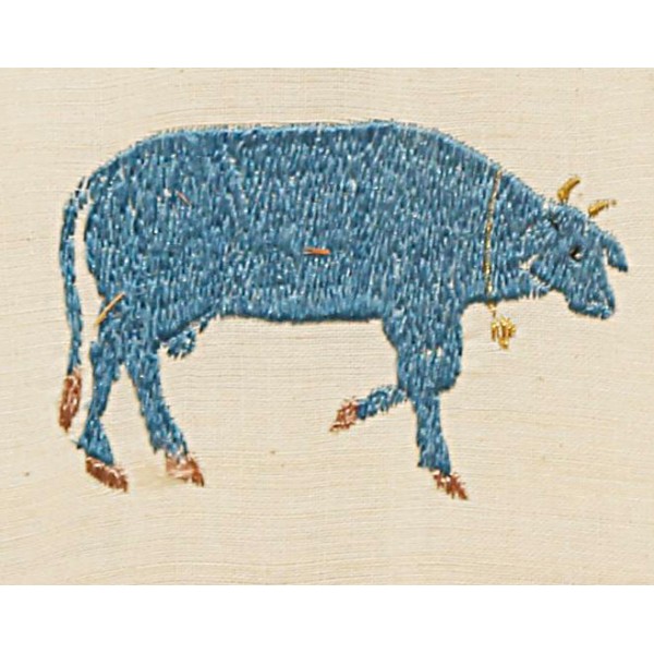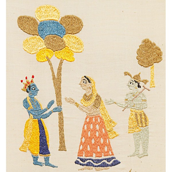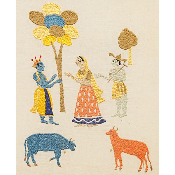 This Divya Charitra wall hanging portrays Krishna in his divine Swaroop, standing gracefully. Surrounded by devotees, the design reflects their reverence and devotion. The intricate cow motifs symbolises harmony and devotion for krishna in each being.