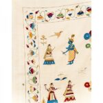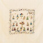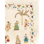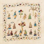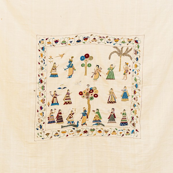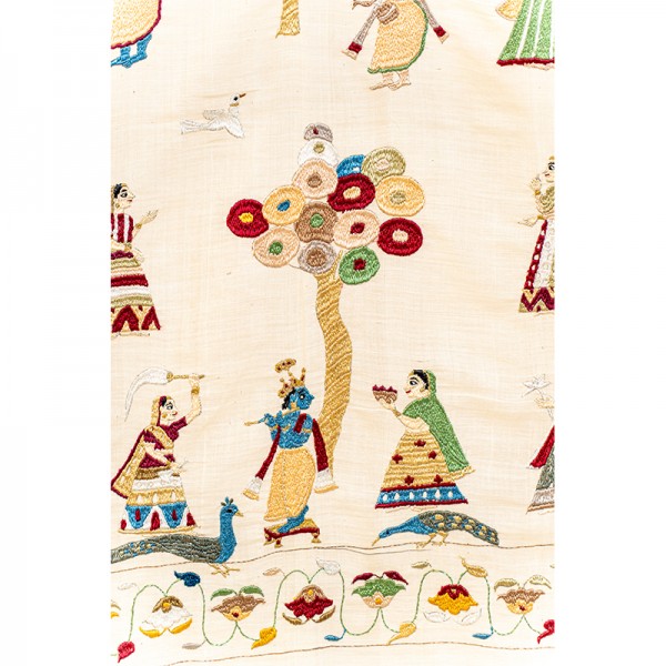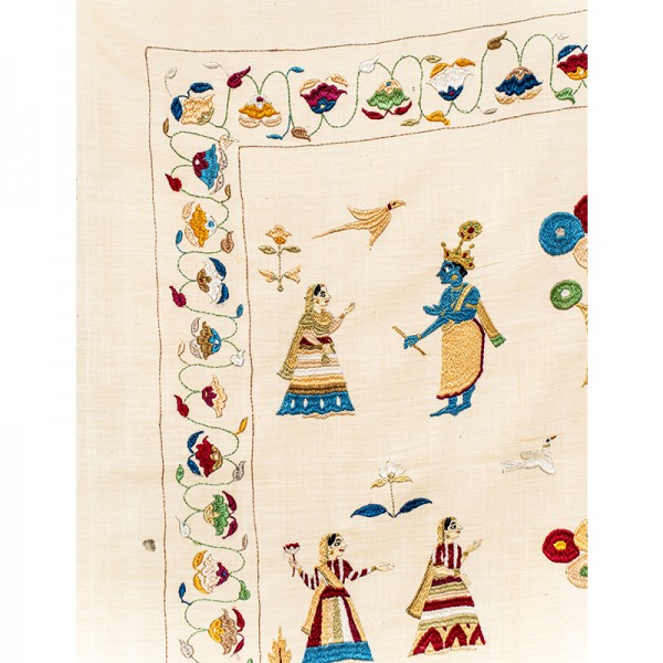 The Kadam Vatika Chamba Rumal illustrates various roops of Krishna in captivating scenes, each radiating divine charm. Hand embroidery in the miniature style brings to life intricate details, including floral borders and elegant peacock motifs, blending devotion, nature, and artistry harmoniously.