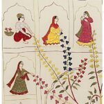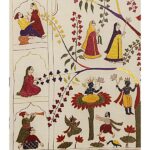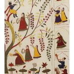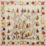 The Kadam Vriksh Chamba Rumal showcases Krishna’s divine forms under a magnificent tree, playing the flute and enchanting devoted gopis. Borders intricately feature gopis within jharokhas alongside floral patterns, seamlessly blending devotion, storytelling, and vibrant artistry through miniature-style hand embroidery.