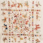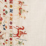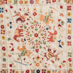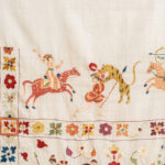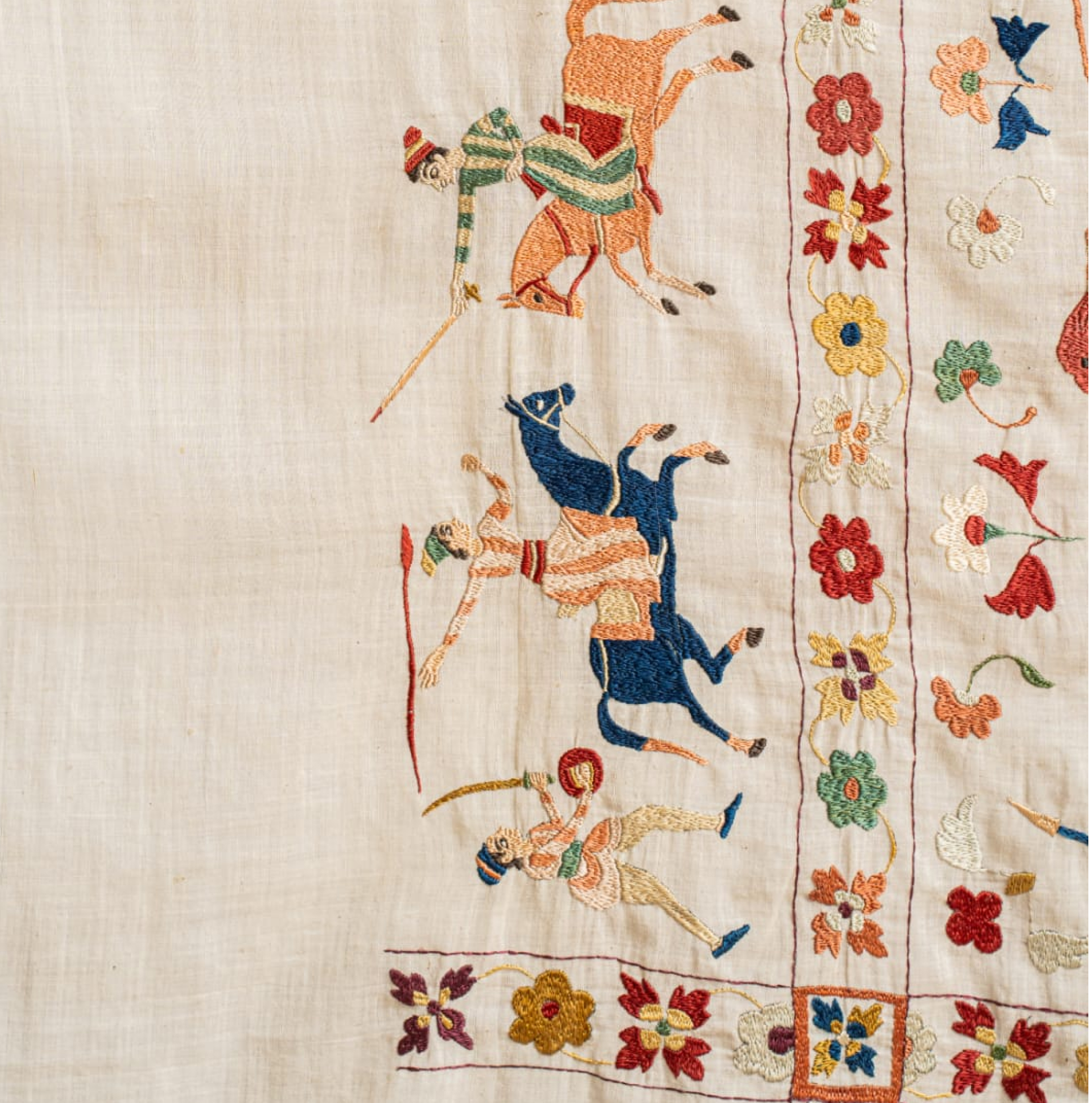 This rumal depicts the journey of a noble man traveling and fighting his enemies, his encounters with wild animals and demons. It shows how he survived them as a winner, witnessed by angels at the corners. Horses, elephants, camels, wild boars and dogs can be seen in beautiful textures. The hero rides with weapons on action‑oriented horses in full swing. The beautiful borders separate the canvas.